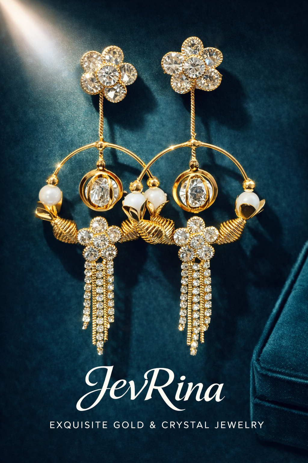 The JevRina Aurora Crystal Tassel Earrings are designed to make a refined yet striking statement. Featuring a floral crystal stud top, these earrings flow into a delicate gold-tone arc adorned with pearl accents and a central faceted crystal drop. The design is completed with cascading crystal tassels that add graceful movement and brilliance with every turn.