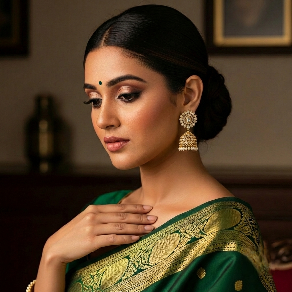 Jhumka Earrings: The earrings feature a beautiful stud top that transitions into a traditionally carved bell (jhumka), finishing with elegant pearl drops that provide graceful movement.