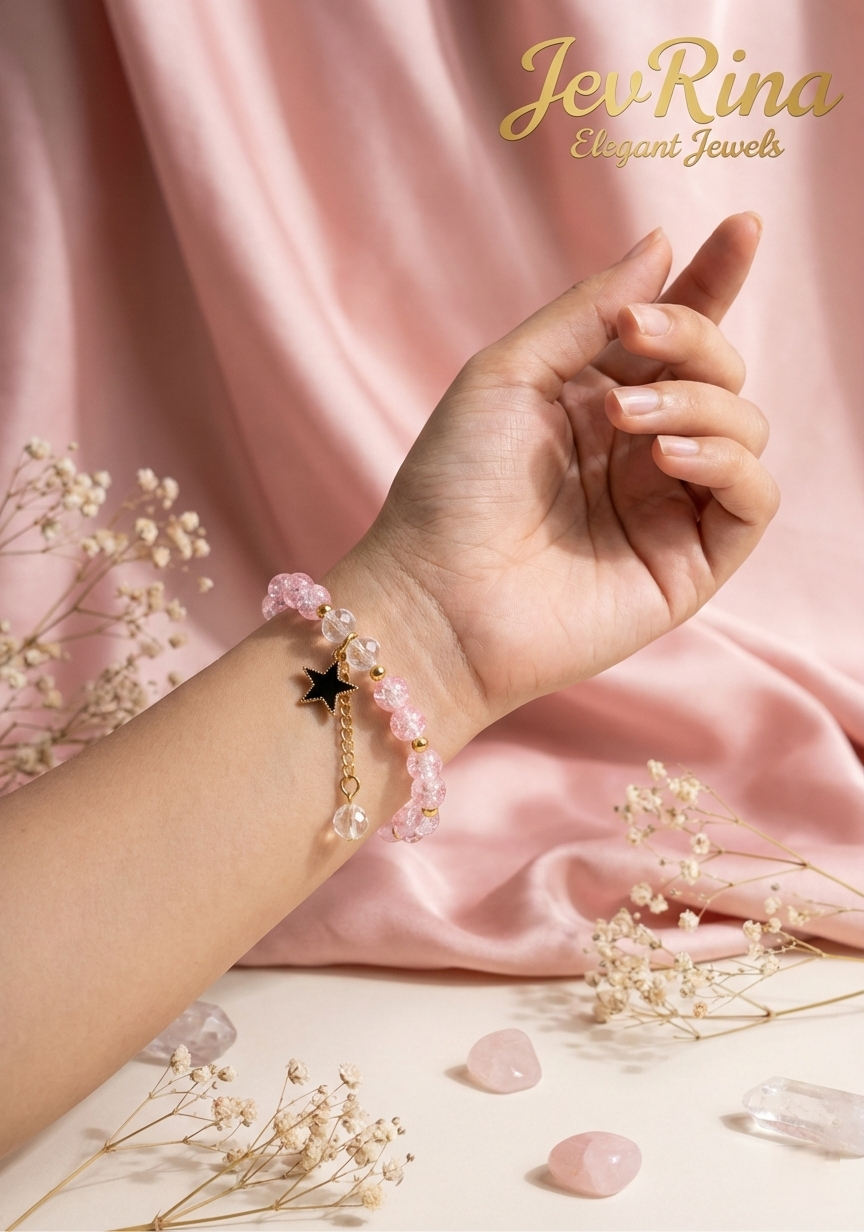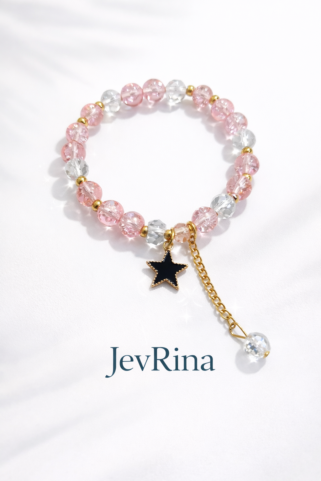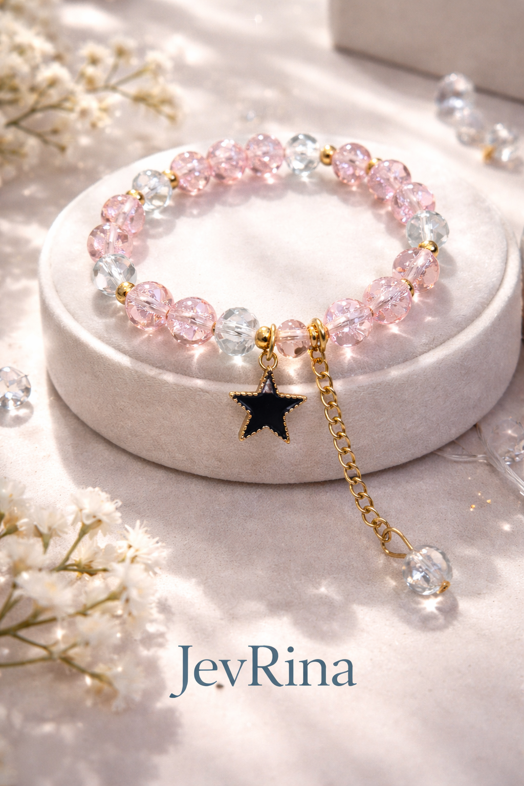 The JevRina Pink Crystal Beaded Bracelet is designed for women who love subtle beauty with a touch of charm. Crafted with shimmering pink crackle beads and clear crystal accents, this bracelet reflects light beautifully with every movement. The delicate gold detailing and statement black star charm add just the right contrast — making it perfect for both everyday wear and special occasions.